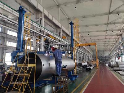 该HJ系列悬臂式筒体直环缝自动焊机主要用于压力容器筒体在钢板卷圆后的直缝焊接、两节或多节筒体接长环缝焊接及筒体与封头、法兰的环缝焊接。 该设备由十字悬臂焊接机、驱动滚轮架及焊接电源等组成,采用滚轮架驱动工件旋转,焊枪相对固定焊接环缝; 采用工件不动,十字悬臂焊接机悬臂升缩焊接直缝,是压力容器生产制作的理想装备。